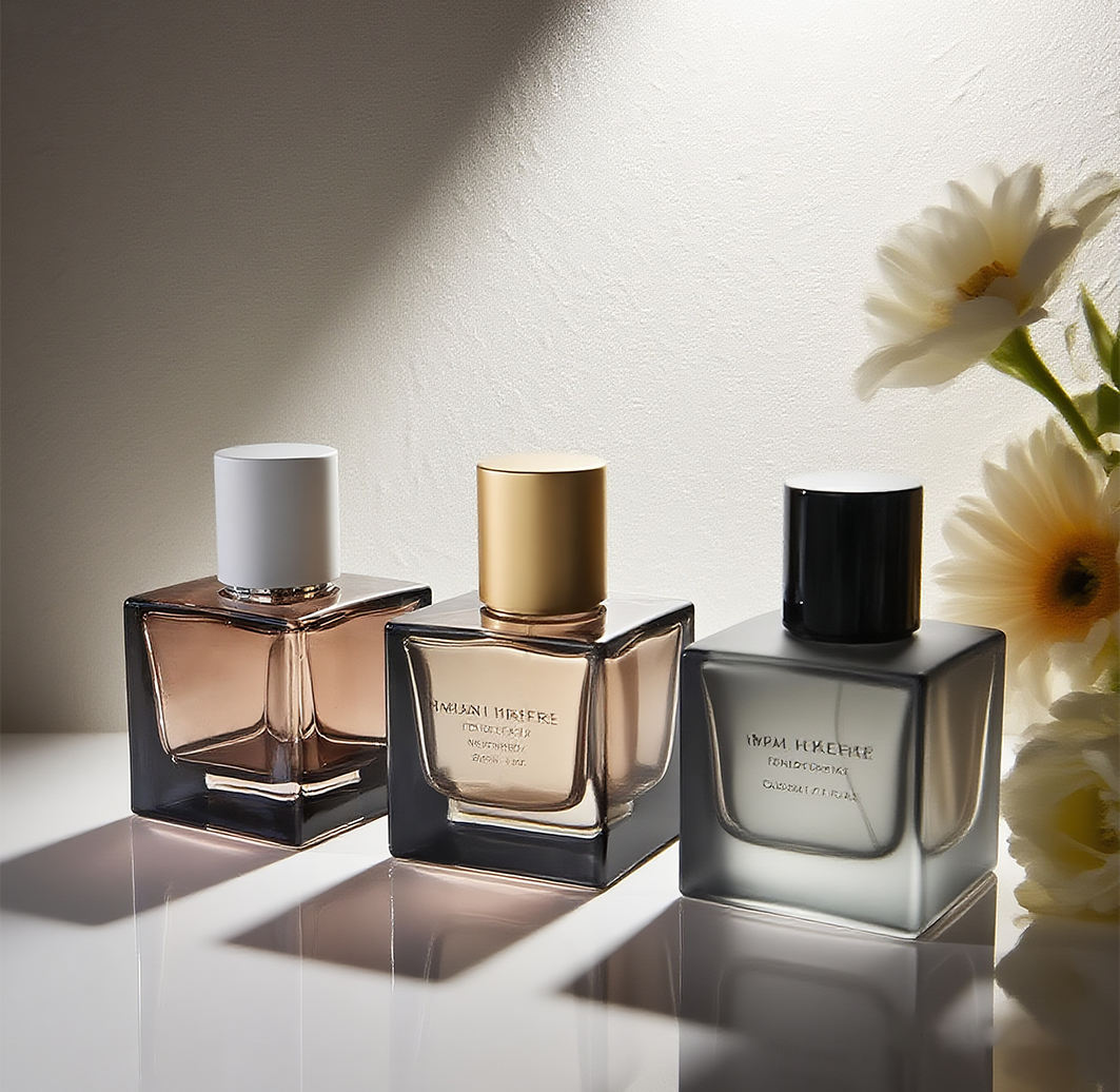 30ml and 50ml square colorful glass perfume bottles with lid and clear pump spray head, ideal for wholesale fragrance and cosmetic packaging.