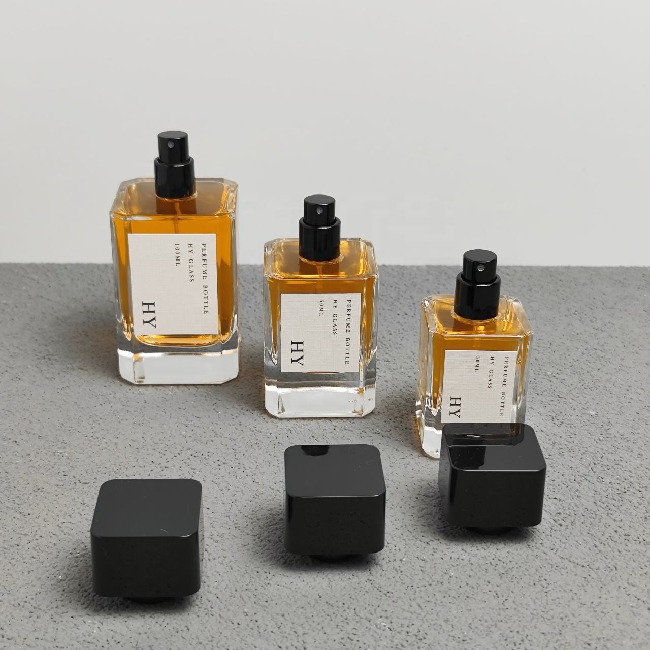 Elegant empty 30ml–100ml square glass perfume bottles with black square caps and pump sprayers, perfect for luxury fragrance brands.